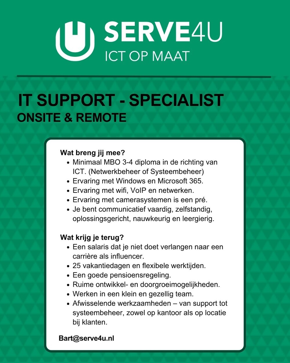 Zaterdag 25 oktober 2025Houdt jij van een uitdaging? Bij Serve4u werk je zelfstandig aan uiteenlopende ICTprojecten